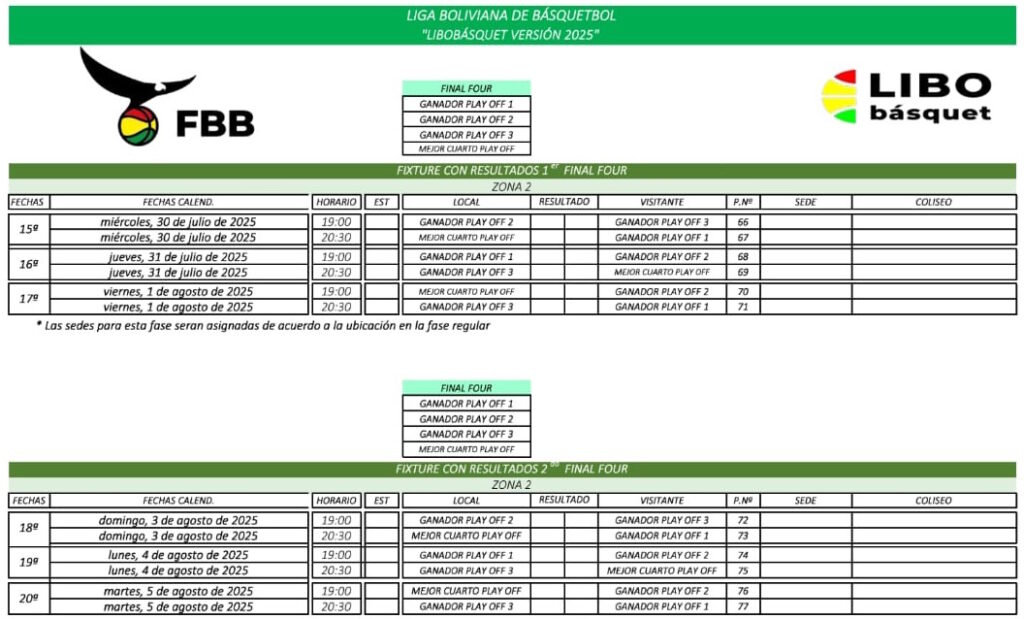 Así como sucedió la gestión 2014 en la primera edición de la ‘Libo’, los 4 mejores equipos jugarán en 4 sedes de Final Four para decidir al campeón de esta edición, es decir 3 zonas se jugarán en la ciudad de Potosí y la restante en la ciudad de Sucre.