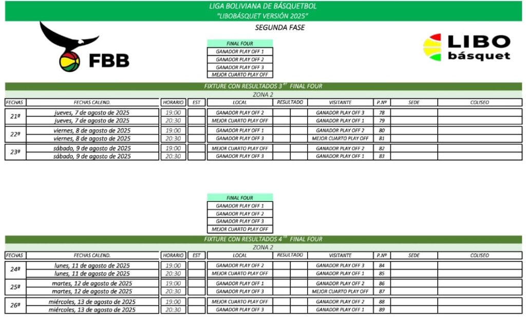 La Liga Boliviana de Básquetbol ingresa a la recta final del torneo, y a diferencia de años anteriores ya no se jugarán semifinales ni finales, sino cuatro zonas de Final Four con los 4 equipos clasificados para decidir al campeón de la Libobásquet 2025.